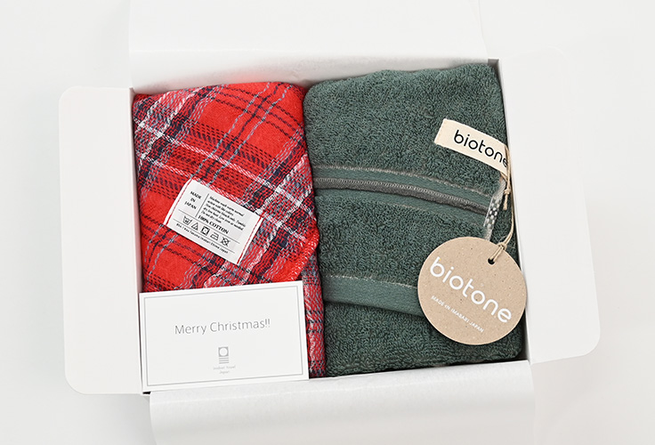 くすみカラーのリバーシブルがおしゃれな”biotone”のフェイスタオルと、クリスマスらしいタータンチェック柄で、やさしく手に馴染むガーゼ&パイルの”タータンチェック”のフェイスタオルの、クリスマスを思わせるカラーを組み合わせた限定セットです。