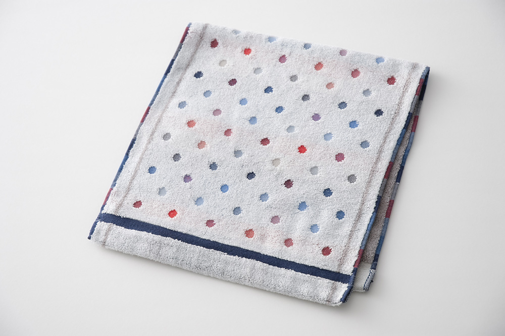 また、糸と糸の間に隙間が多いため、通気性も高く、水分を素早く吸収してくれます。表面と裏面で異なる色のタオルに、多色の糸が織りなす色彩豊かなドット柄が可愛らしいデザインです。