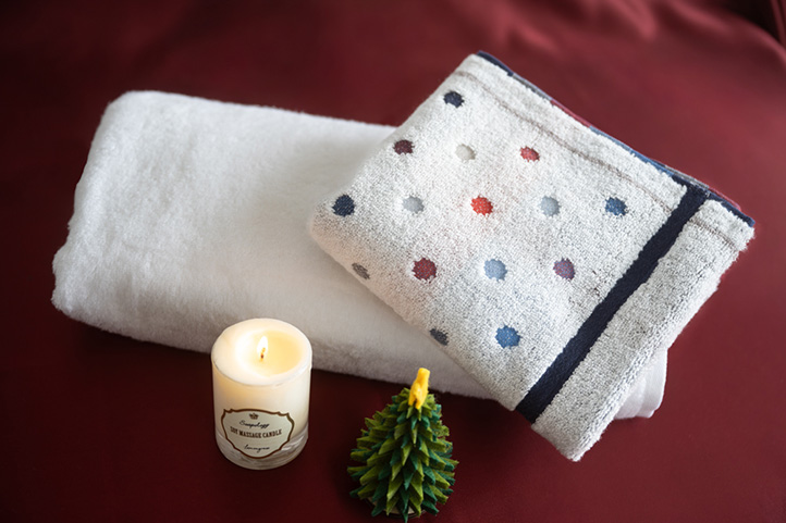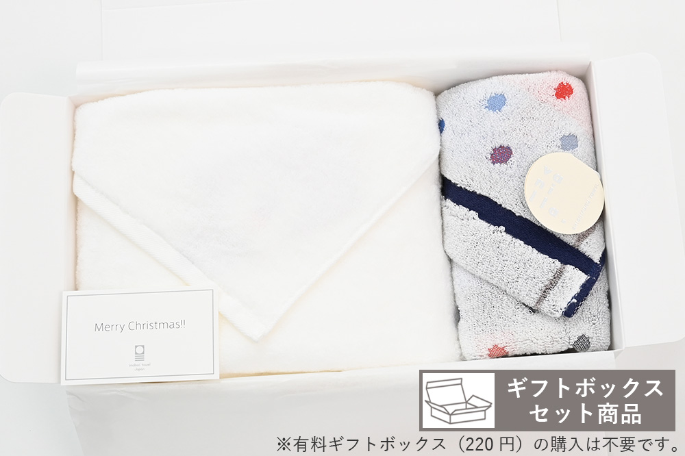 公式オンラインストア・本店・南青山店にて期間・数量限定のクリスマスギフトをご用意いたしました。こちらは、羽毛のような柔らかさと軽やかな感触の”プリューム”のバスタオルと、多色の糸が織りなす色彩豊かなドット柄が可愛らしい”SDオプス”のフェイスタオルの、ホワイトクリスマスを思わせる、白いタオルのみをセレクトした限定セットとなっております。