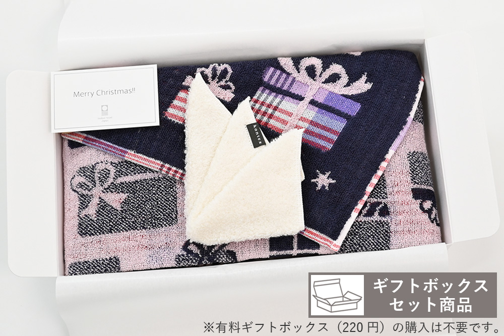 公式オンラインストア・本店・南青山店にて期間・数量限定のクリスマスギフトをご用意いたしました。こちらは、カラフルなギンガムチェックのギフトボックス柄の”グラッド”のバスタオルと、ふんわりやわらかな”わたふわハンカチ”の、クリスマスプレゼントにぴったりなタオル2枚の限定セットとなっております。