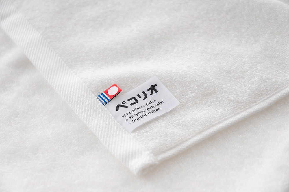 「ペコリオ」とは、ペットボトル+芯(コア)+リサイクルポリエステル+オーガニックコットンの頭文字。糸の芯部分には回収されたペットボトルを原料としたリサイクルポリエステル、外側にはオーガニックコットンを使った環境に優しいタオルです。二重構造の「QUICK DRY cotton ECO」という糸を使用しており、コットンの吸水性に加えて、ポリエステルの優れた拡散機能により、水分を素早く吸水し、さらに早く乾くのが特長です。
