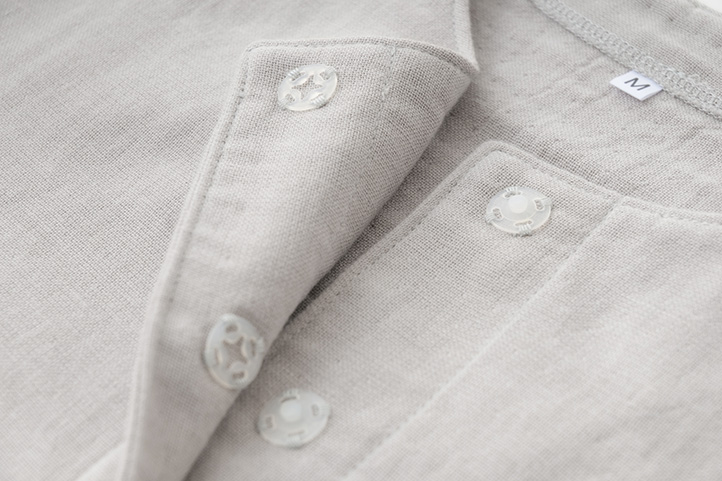 ガーゼ生地なので吸水性がよく、汗をかいても素早く吸い取ってくれます。両サイドにはポケットがついており、ウエストのタックがアクセントになっています。